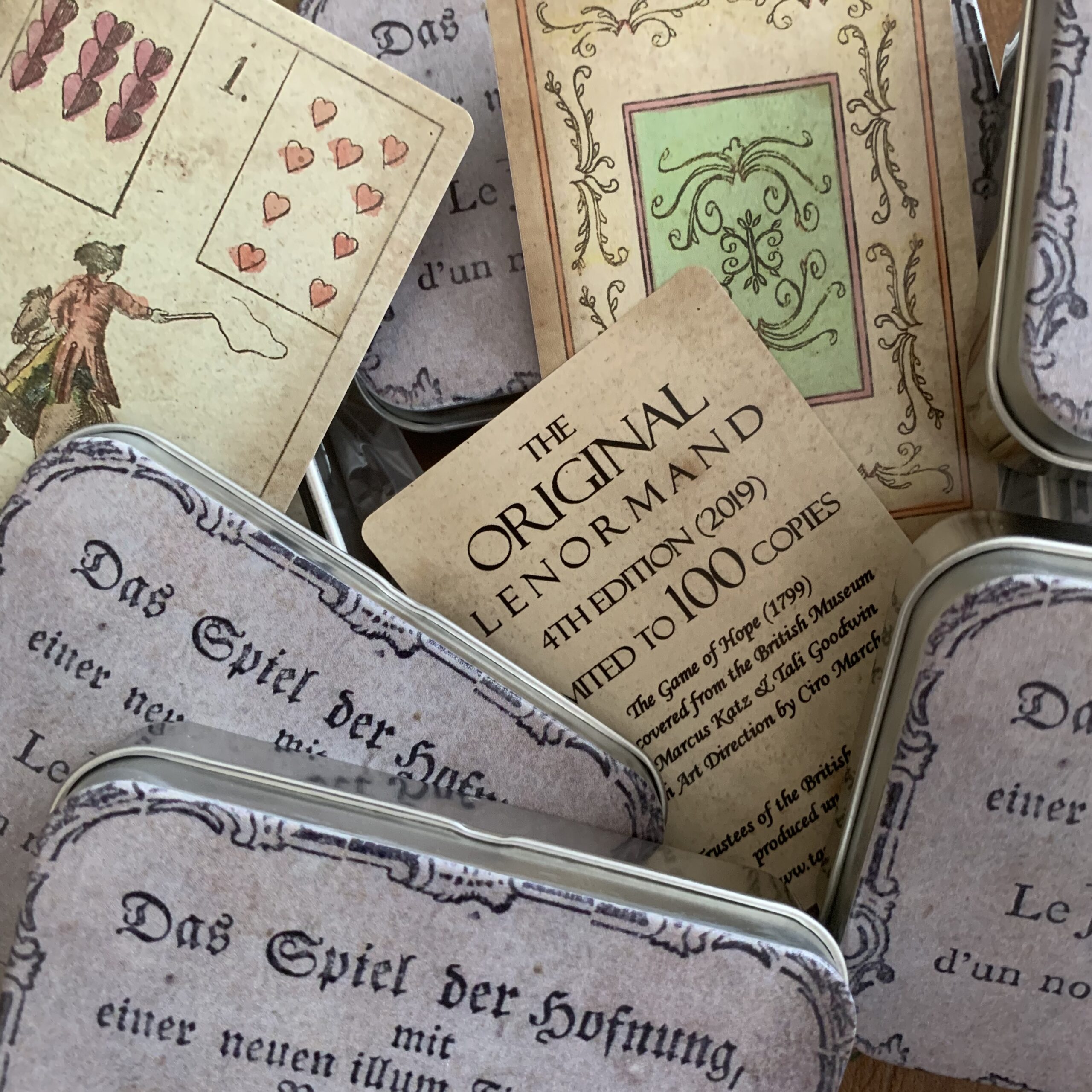 Your chance to acquire one of only 100 copies of each of the 4th-6th (latest) editions Original Lenormand deck, a reproduction of the actual Game of Hope deck in the British Museum, printed under license.